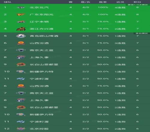 目前北京和广东4胜0负领跑全联盟,辽宁和广厦分列三四名,而天津、江苏和四川则是一生难求,0胜4负排在联盟最后三位。